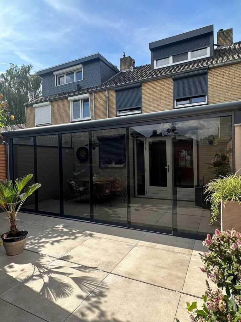Een getinte glazen schuifwand geeft je veranda een moderne en luxe uitstraling. Het getinte glas vermindert fel zonlicht en inkijk, terwijl je toch optimaal blijft genieten van het uitzicht op de tuin.
